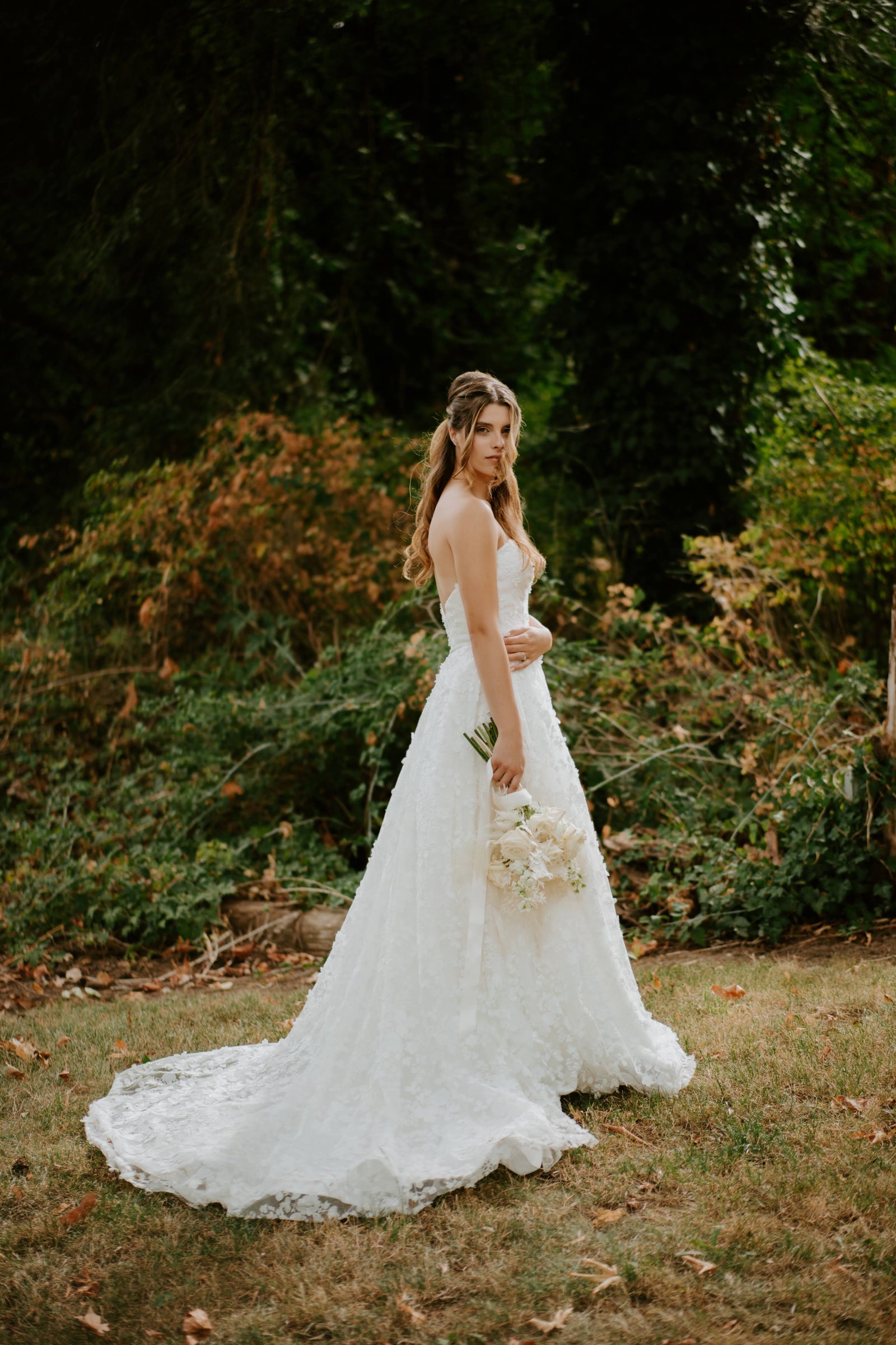 Lace applique is a more modern and very popular style of lace. Unlike sheet lace, lace applique comes in pieces that are applied (hence the name) to a gown in a specific area or placement! This style of lace is what our beautiful bride Caroline used all over her stunning Lace & Liberty gown. Her design features a A-line silhouette, a sweetheart neckline and a train for the epitome of romance!