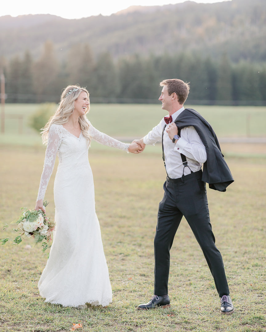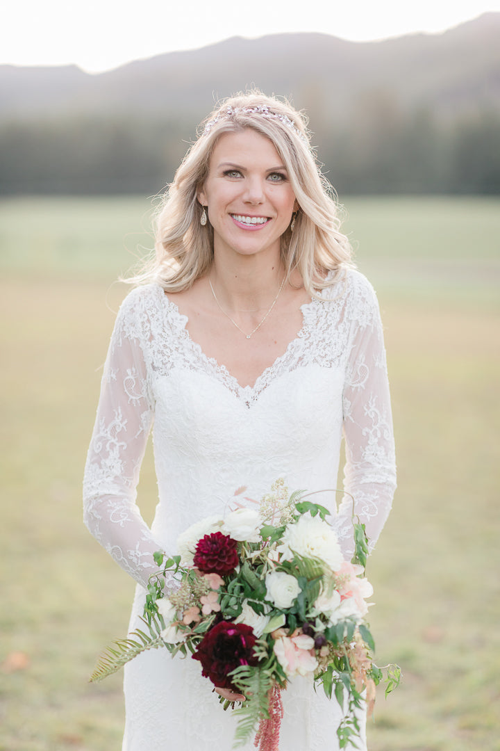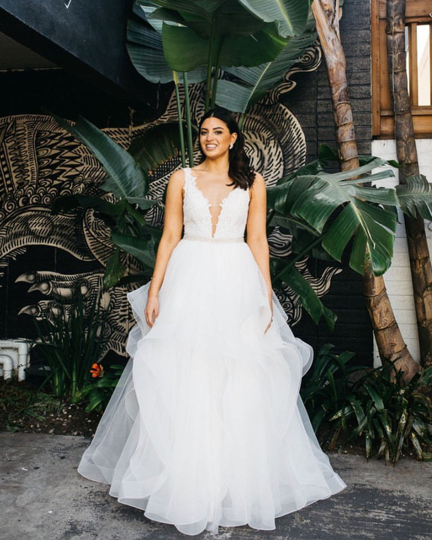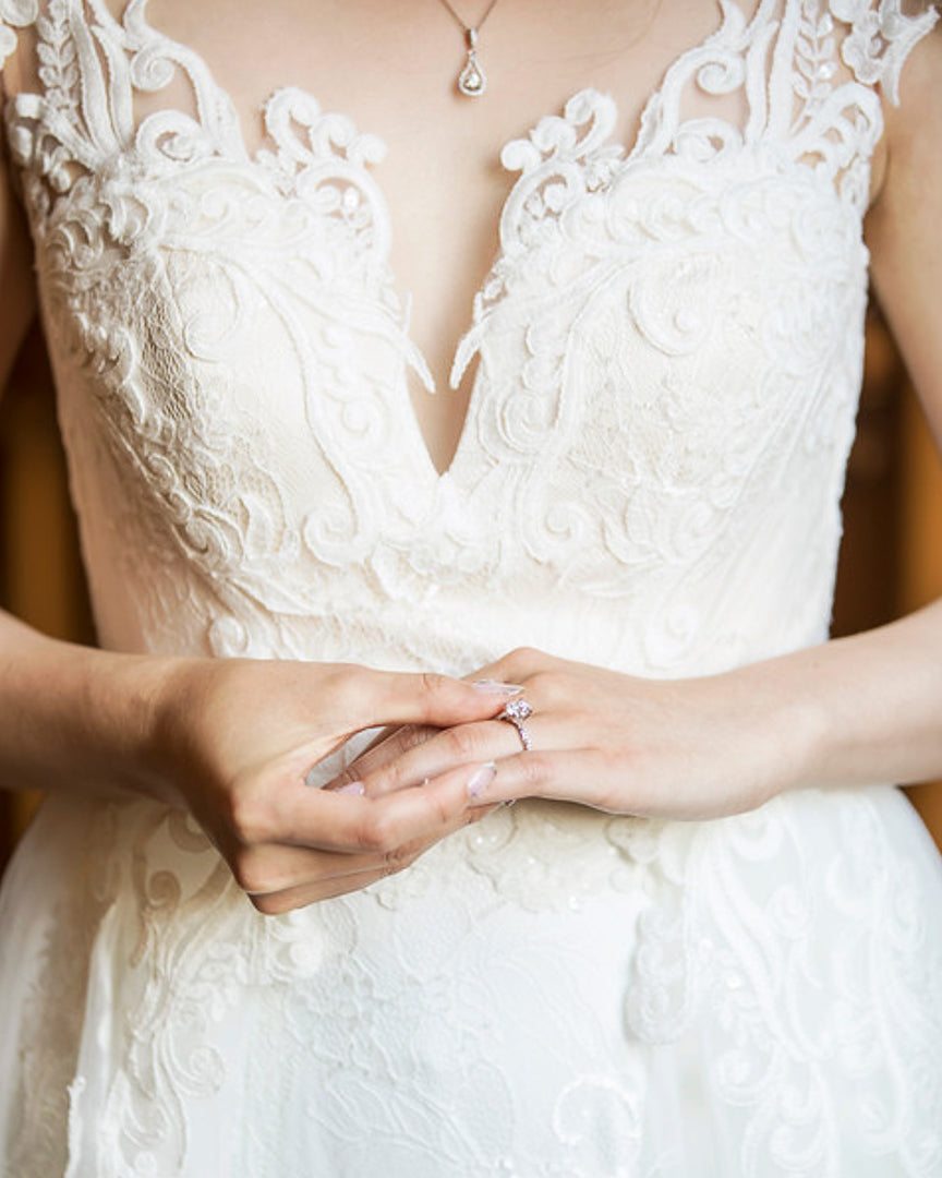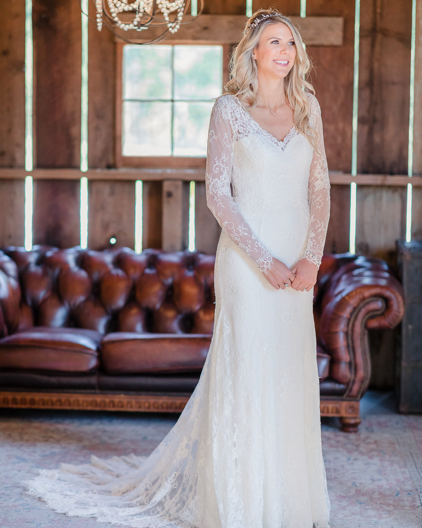 Craving a mix of romantic and classic? Having lace only on the bodice of your gown could be perfect! Our bride Kelly did just that! Kelly’s design features delicate sheet lace on the bodice of her dress with those perfect long sleeves. Paired with a classic A-line tulle skirt, this is the perfect combination to make the lace of your gown stand out and create some contrast between your bodice and skirt!