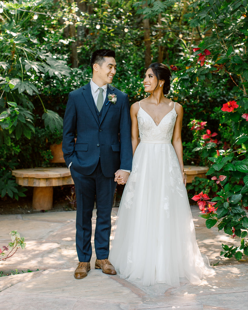 Not so into floral lace? Geometric lace might be perfect for you! This style of lace uses more lines and swirl motifs and has a regal look that is fit for a queen! Our bride Jenny layered geometric and sheet lace to create an elegant bridal gown with nude illusion straps and lace that fades down the length of her skirt!