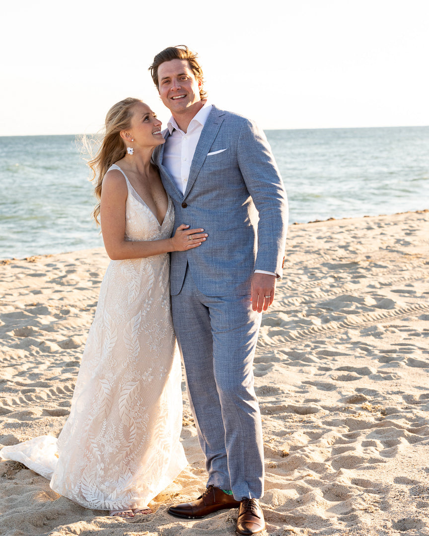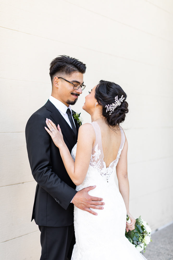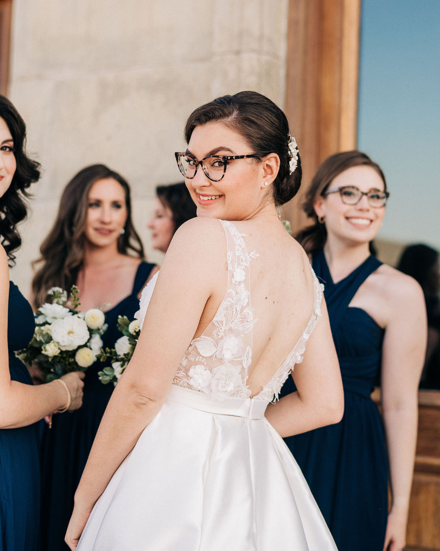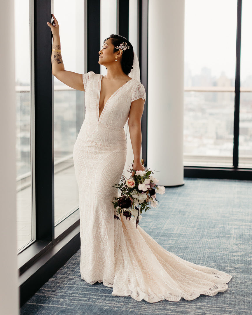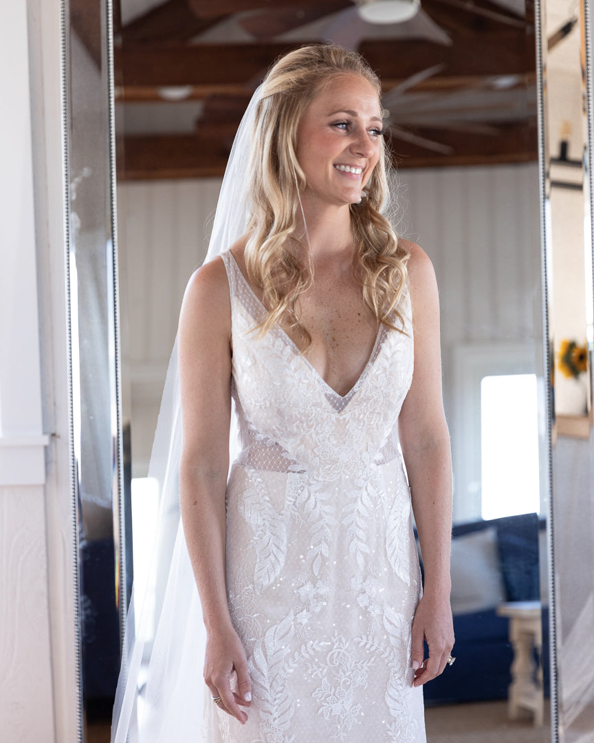If you think of a classic lace wedding gown, you might think of sheet lace! This delicate lace is created in sheets that are lightweight, with a consistent floral pattern, and vintage look! Sheet lace also typically has a stunning scalloped edge details on it that creates a soft and romantic feel. Our bride Andrea, created a gorgeous gown with all-over sheet lace with a scalloped edge on the neckline for a timeless look!