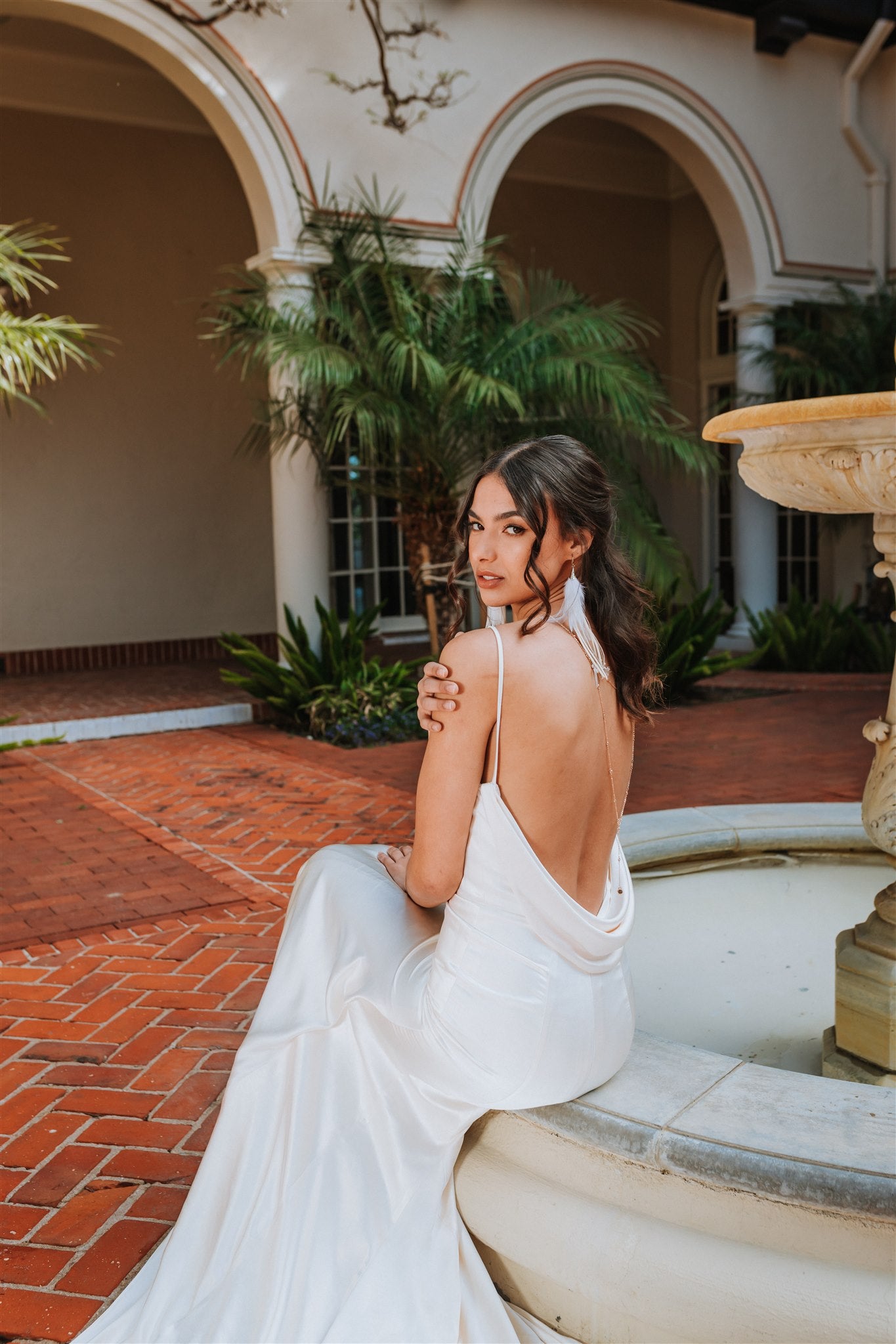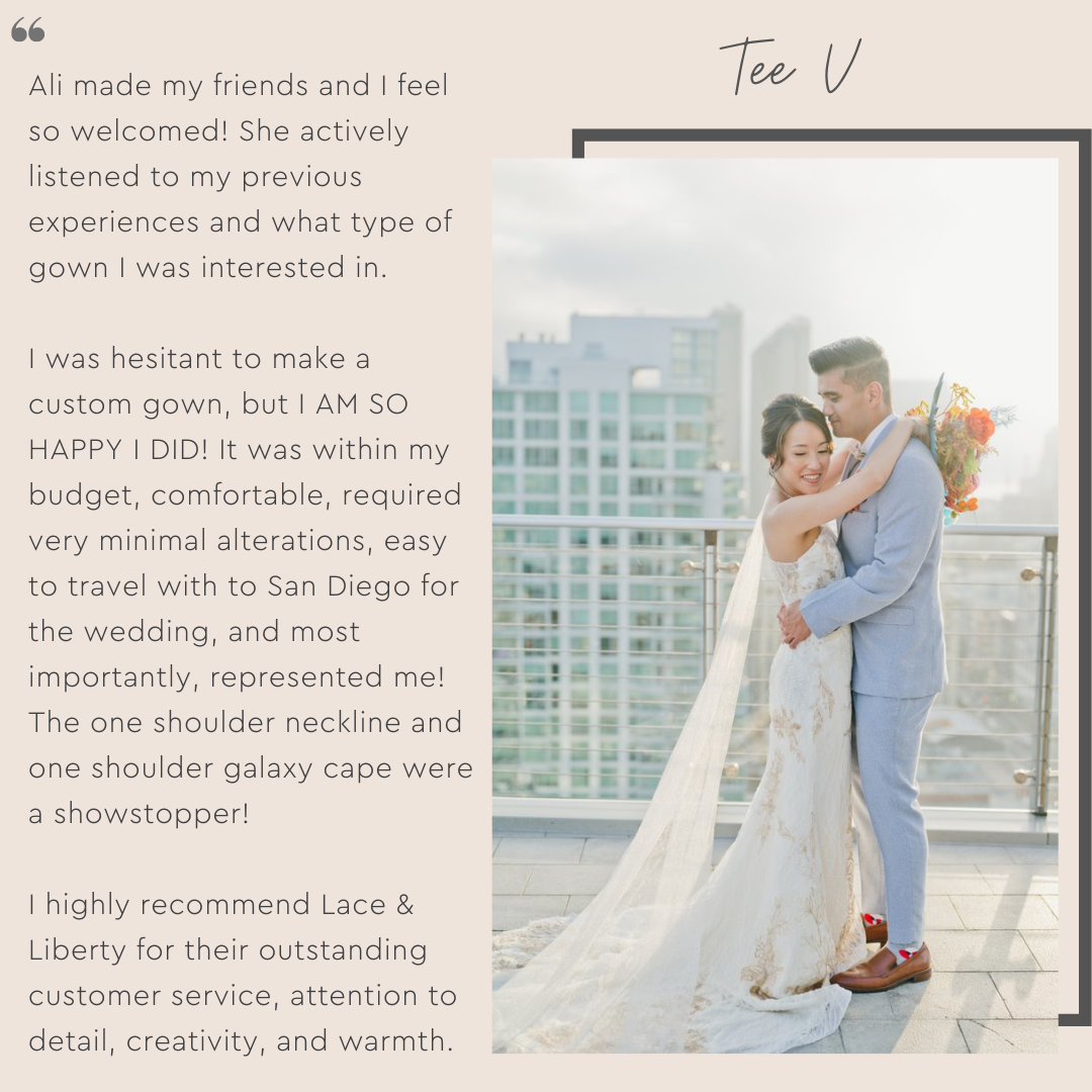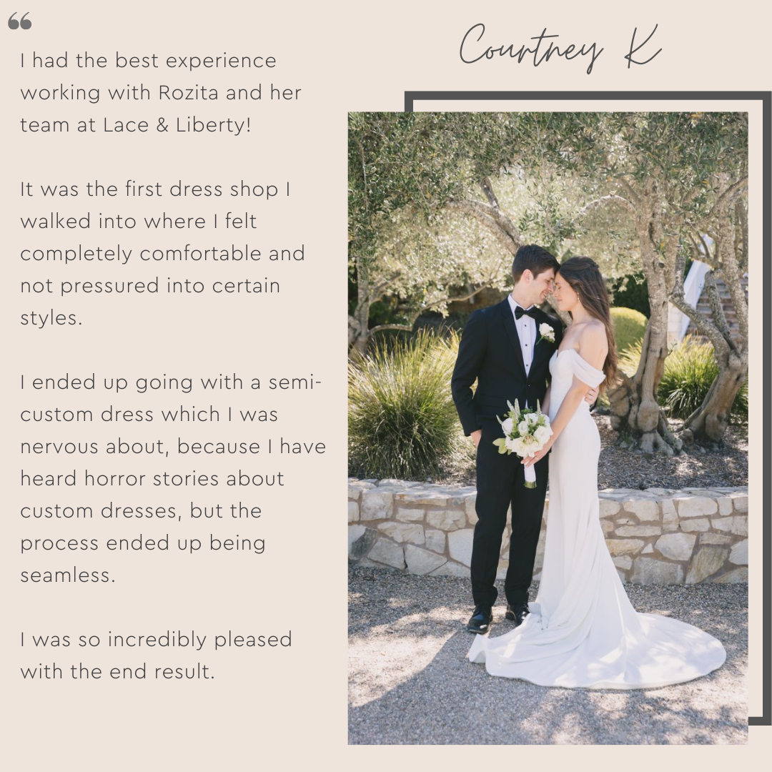 Lace & Liberty designs are inspired by our confident & free-spirited brides, who do everything on their own terms. Being in California, the sun & dramatic coastlines are a part of our fiber, which is reflected in the movement and versatility of our designs. In addition, we see comfort as crucial and use the highest quality fabrics to ensure this.